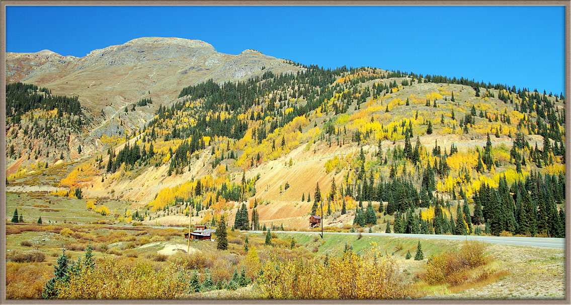 The portion of U.S. 550 which runs from Montrose through the San Juan Mountains and connects Ouray and Silverton is amazingly colorful in late September when the aspen leaves are becoming brilliant yellow. Driving through a series of passes higher than 10,000 feet, we see hillsides covered in yellow aspens which fill the skyline for miles around.
